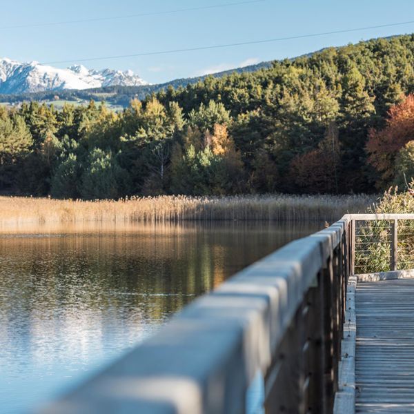 The Raier Moos Nature Trail in Raas is a beautiful route leading through one of the most spectacular areas of moorland in South Tyrol. As you walk along this signposted loop trail, you will find a number of rare plant species and an incredible diversity of birdlife. Information panels lining the route offer a fascinating insight into the ecological importance of the biotope and its unique community of plant and animal life. The footbridge leading into the middle of the lake and the viewing perch hidden in the forest are wonderful spots to stop for a relaxing look around and observe the rare flora and fauna.